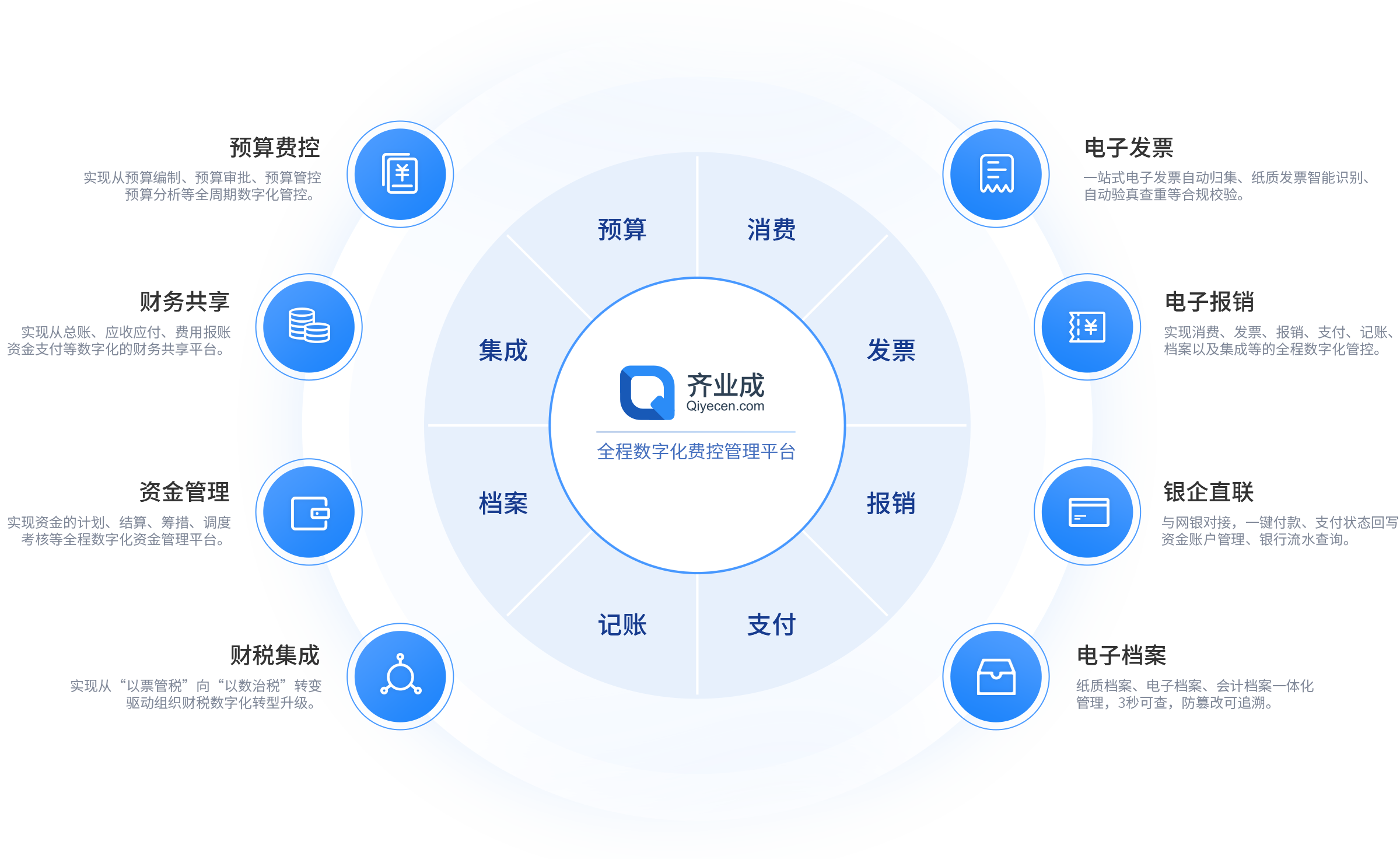 齐业成费控产品的目标:让报销更方便,让费用更可控,让业财更融合。 齐业成致力于为广大政企客户提供从预算费控、财务共享、资金管理、财税集成,到数电发票、电子报销、银企直联、电子档案、商旅集成、消费集成等预算费控领域的专项产品和解决方案,我们提供一站式报销费控闭环,实现预算、消费、发票、报销、支付、记账、档案以及集成等的全程数智化管控。