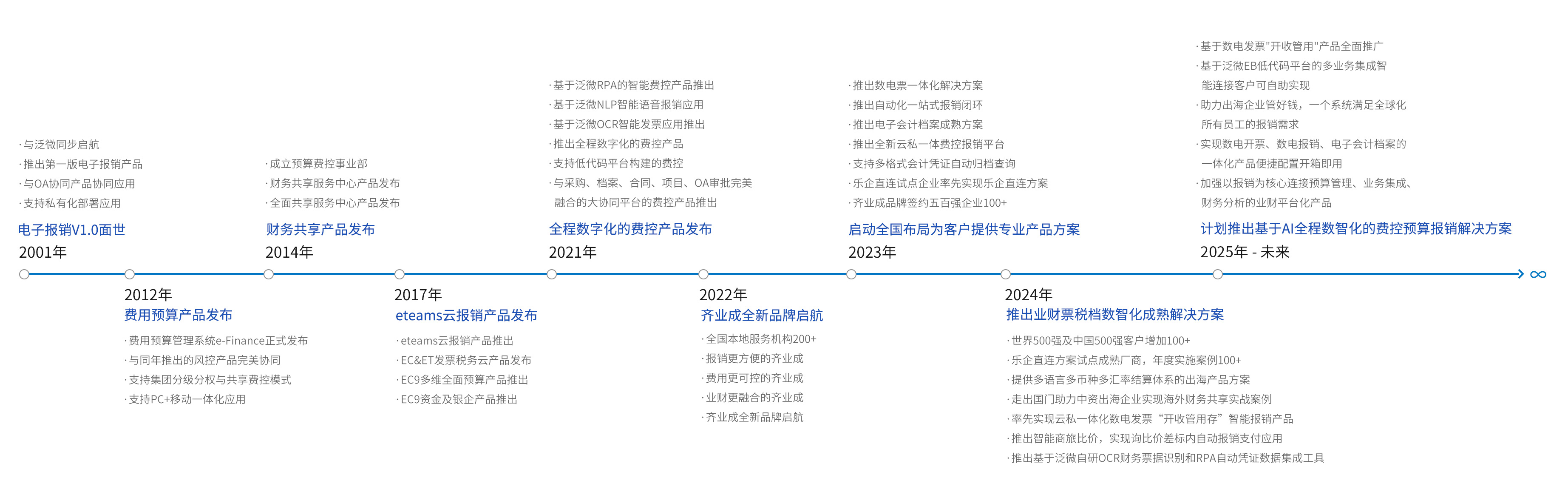 最初为解决无纸化报销和办公需求,我们推出了电子报销流程1.0产品;随后为实现支出合规管控,推出费用预算产品;为实现集团共享型组织管理,推出财务共享服务;为满足企业上云的需求,我们推出费控SaaS版产品;在“大智物联”的背景下,融合智能化和数字化技术后,推出全新一代全程数智化费控产品;历经二十多年深耕业财税票领域,聚合万千生态资源,服务超过万家中大型客户,齐业成全新品牌启航。