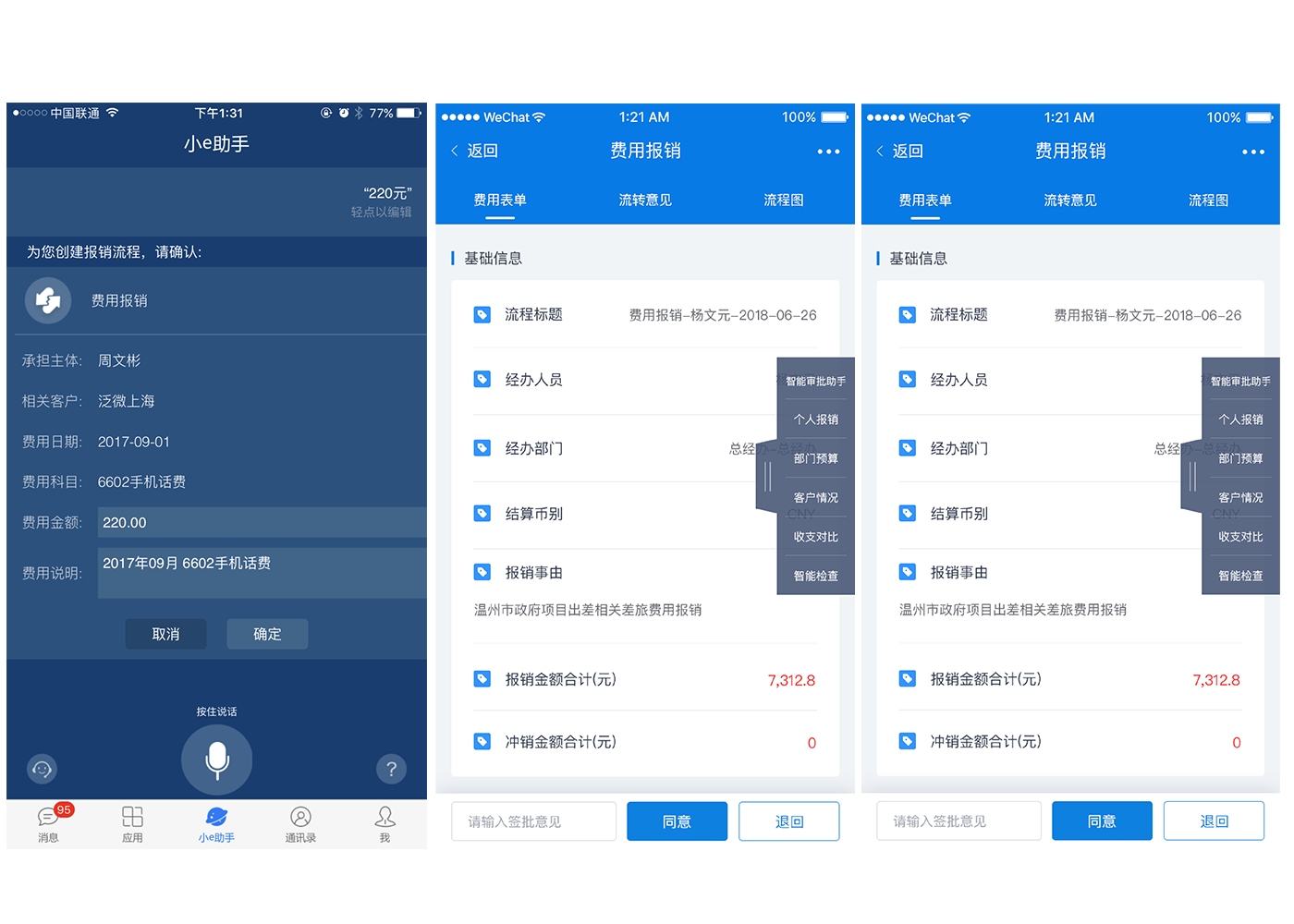 - PC移动一体化报销体验,支持在移动端通过语音一键发起报销,领导随时随地进行审批,页面符合移动端操作习惯和展现方式,并可通过语音一键发起报销,极大提升报销体验。