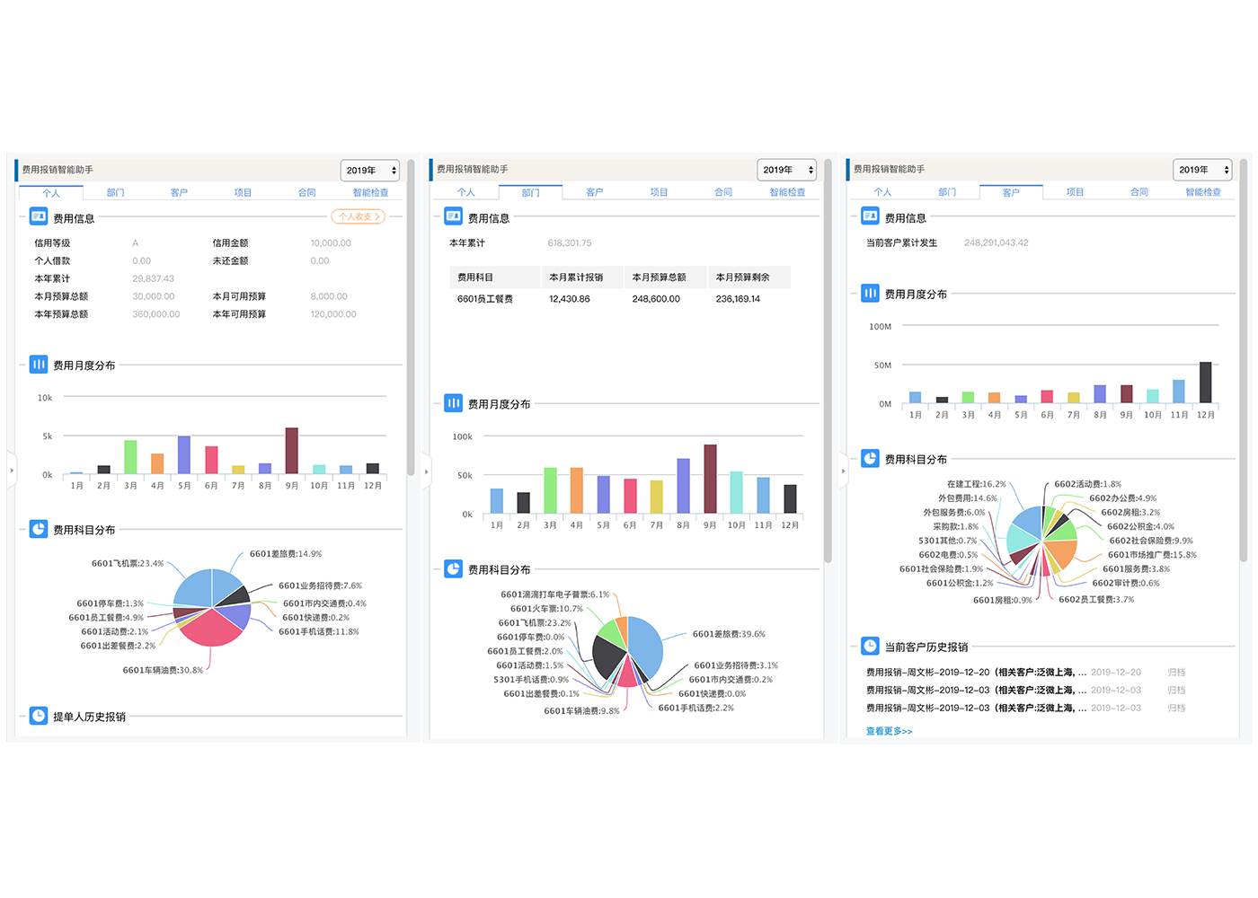 - 在报销审批的时候,能够展现相关联合同、项目情况、人员借款、历史报销情况等,作为领导辅助审批依据。可以根据预先设定的业务合规规则,自动进行合规检查,帮助我们识别潜在风险,同时也让领导的审核更高效、更智能,更合规。