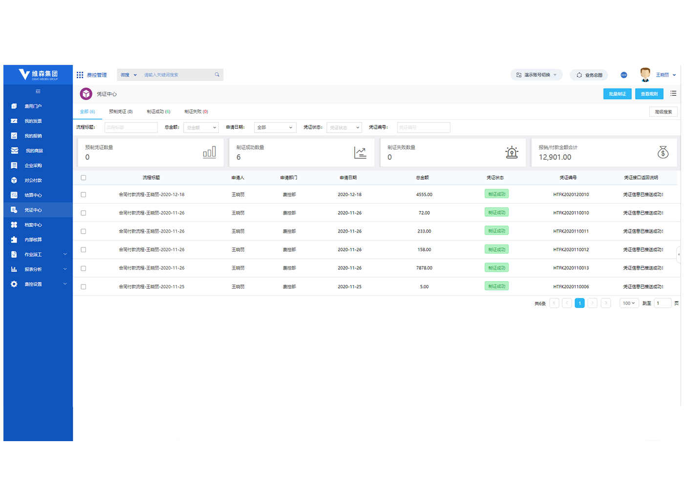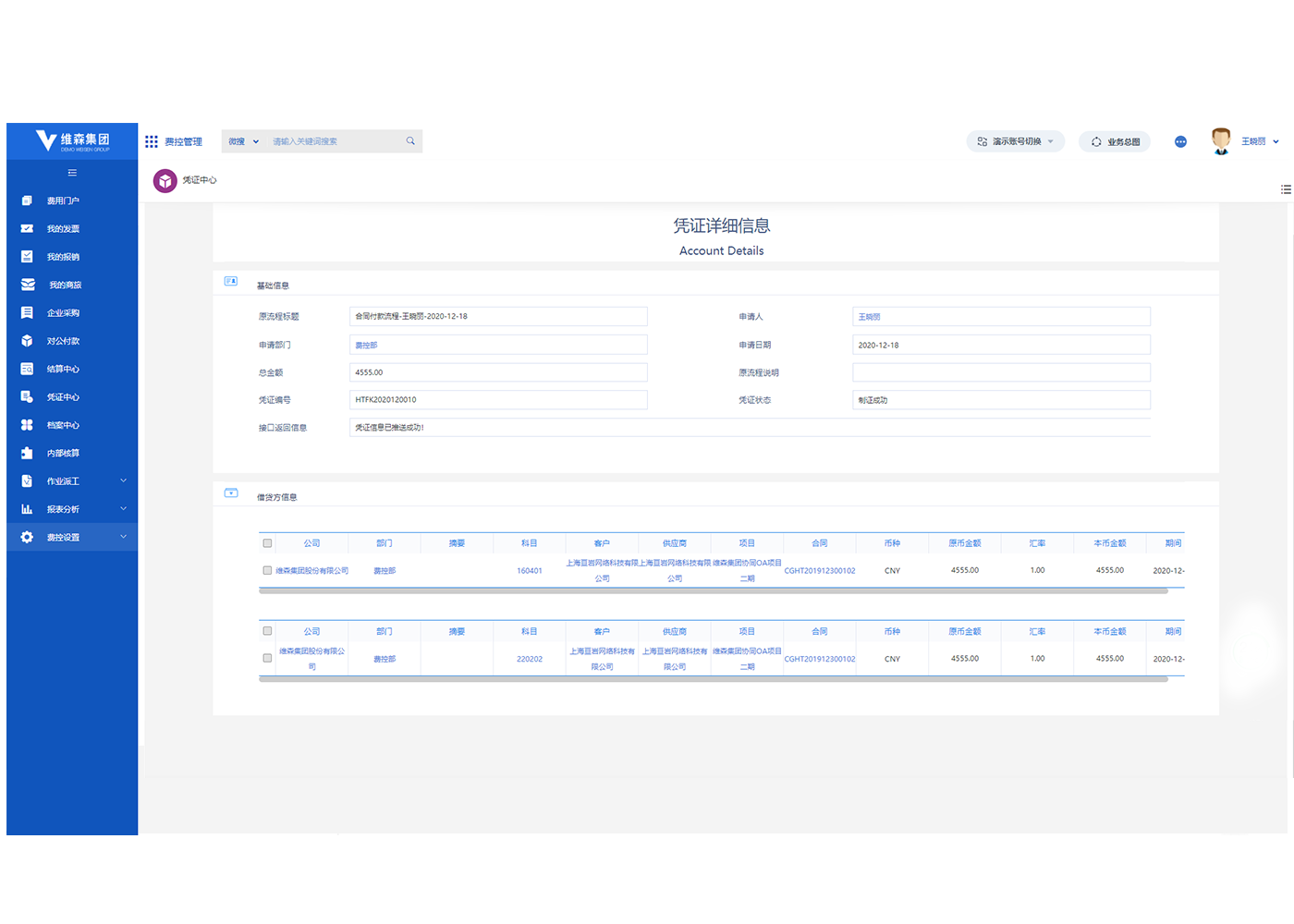 - 通过后台的凭证转换规则,系统自动将报销数据转换为财务语言,包含借贷方科目、金额、辅助核算等预制凭证信息,并推送核算系统生成正式凭证。